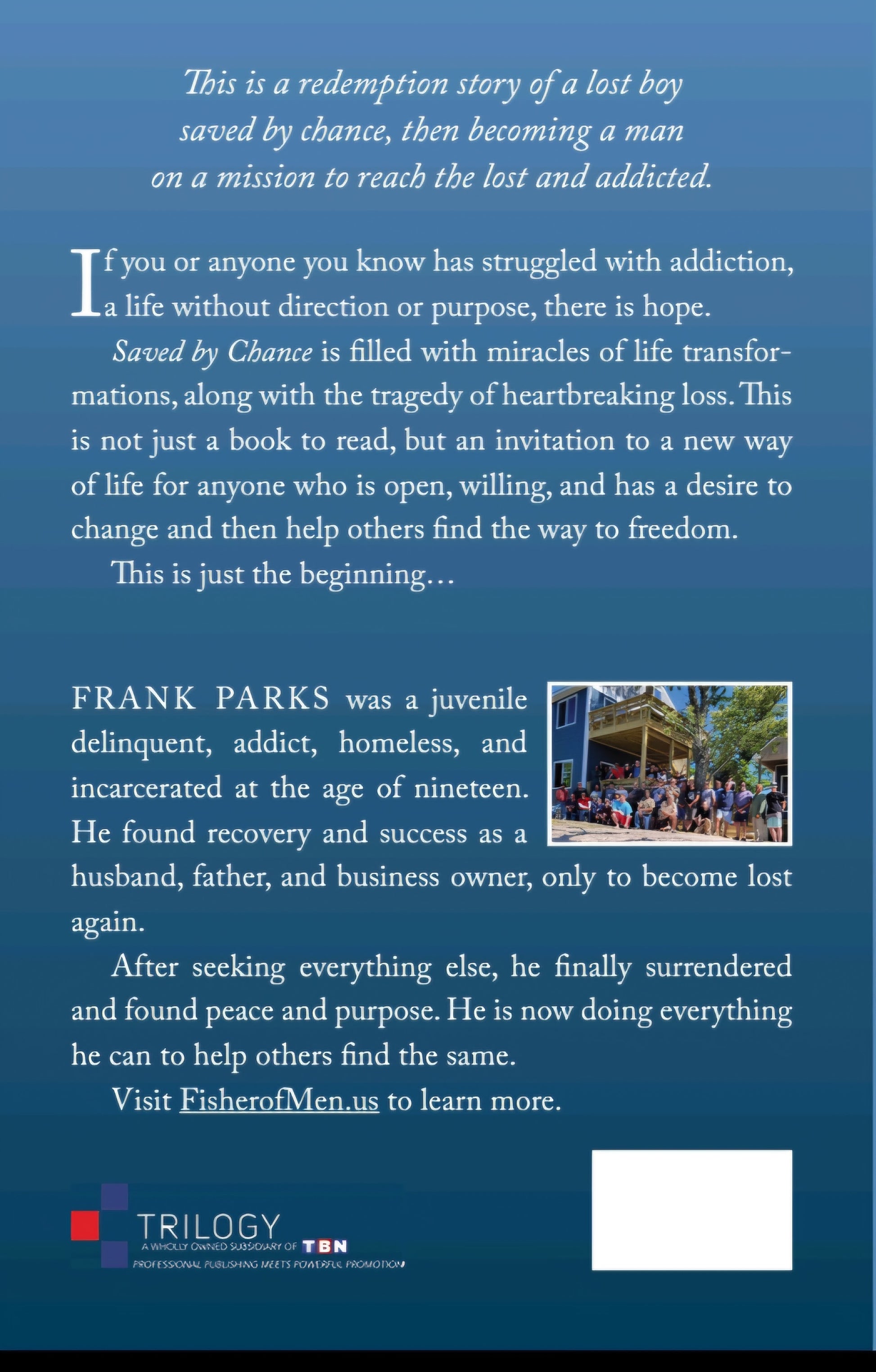 This is a redemption story of a lost boy saved by chance, then becoming a man on a mission to reach the lost and addicted.